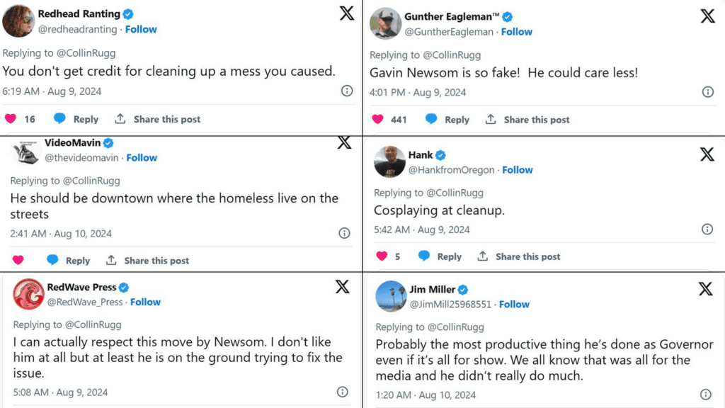 People online shared mixed reactions, thoughts, and opinions on State governor Newsom filming himself during a midday clean-up underneath an overpass in Los Angeles.