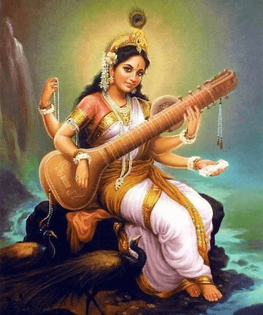 Devi Saraswati is depicted with a lute (veena), symbolizing harmony and rhythm in creative pursuits.